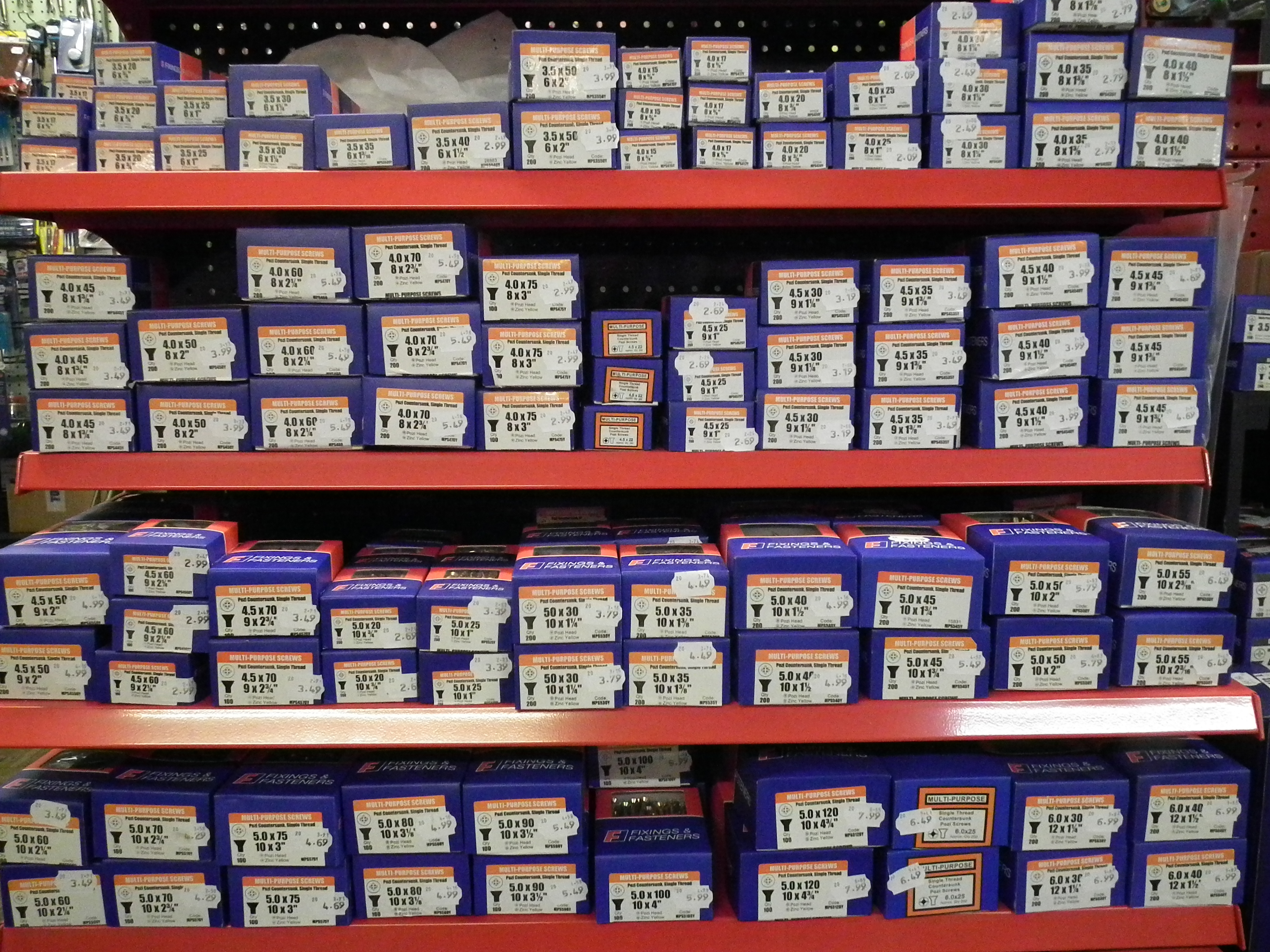 Wood screws, Self Tapping Screws, Nuts and Bolts in a range of sizes, Washers, Nails, Self Tapping Screws, Shelving, Brackets, Washers, Hinges, Screw Eyes, Hooks, Mirror Fixings, Picture Hooks and Picture Wire, Jubilee Clips. Chrome Poles and Fittings, Padlocks Tower bolts, Pad Bolts. Cabin Hooks. ‘S’ Hooks and Butchers Hooks. Pulleys, Letterboxes, Padlocks, Door Locks, WD40 …